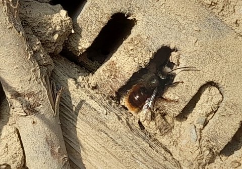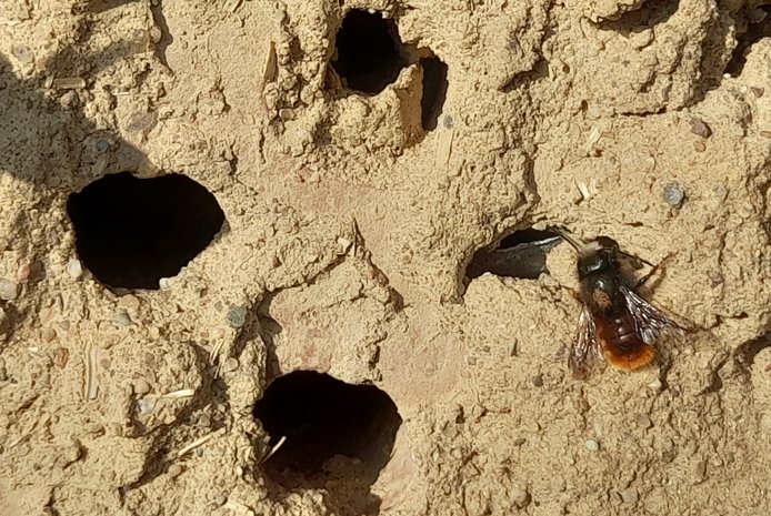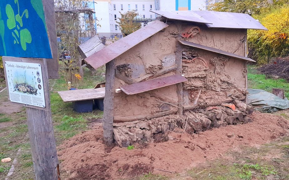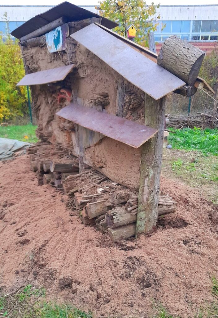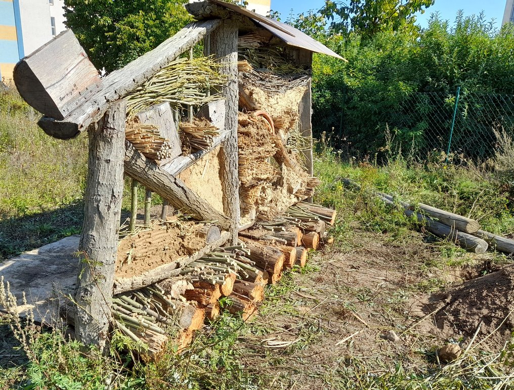 Nach der Fertigstellung des Insektenhotels wird nun fortlaufend das unmittelbare Umfeld für Kleinlebewesen (Insekten und Kinder 😉 weiter verbessert. Eine Blüh – WIESE (kein Rasen) aus Gebietsheimischen Kräutern und Gräsern besteht dahinter, ein Sandarium davor, ein paar mehrjährige Stauden und Wind brechende einheimische Blühsträucher kommen noch dazu. Nun lasst die Obstbäume im Umfeld wachsen und genießt auch mal die Kletterbank für eine stille Pause zur Naturbeobachtung.
